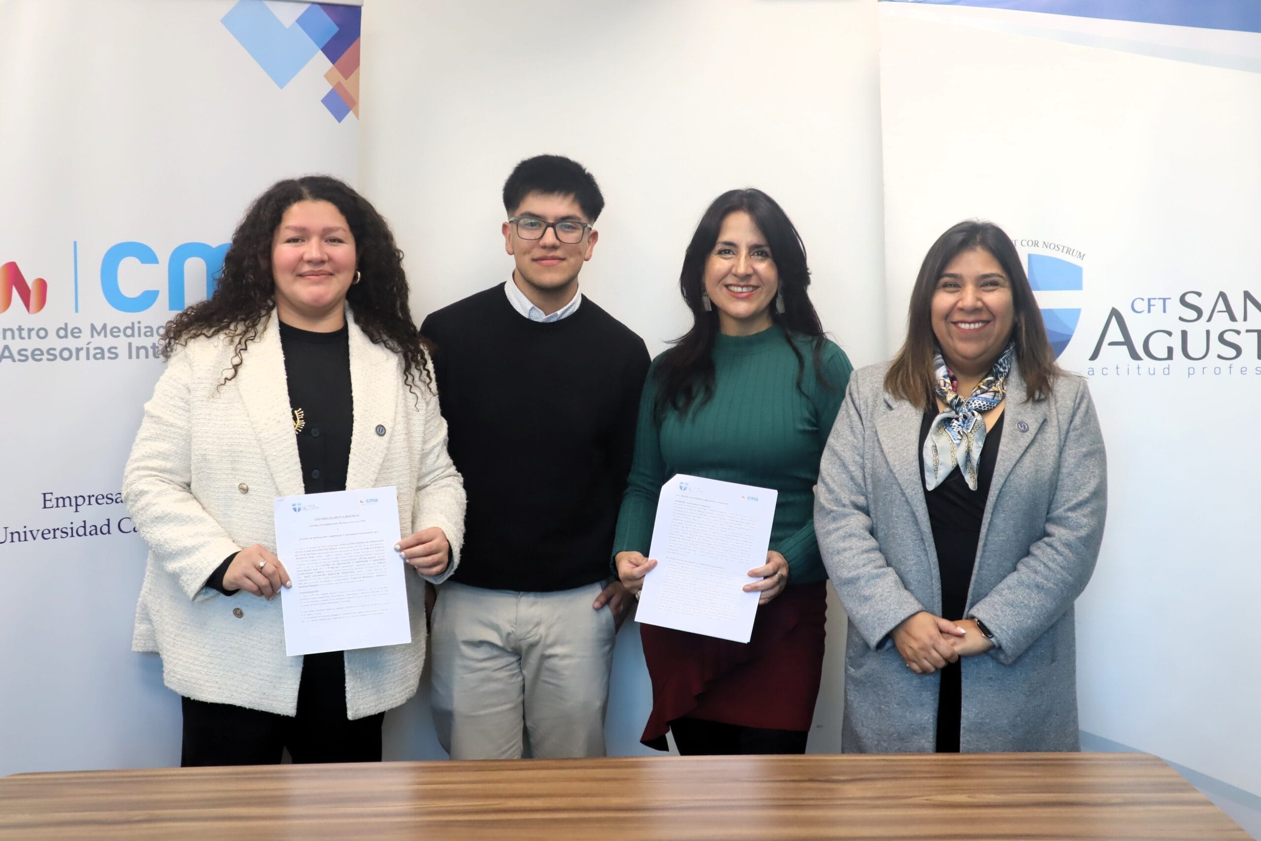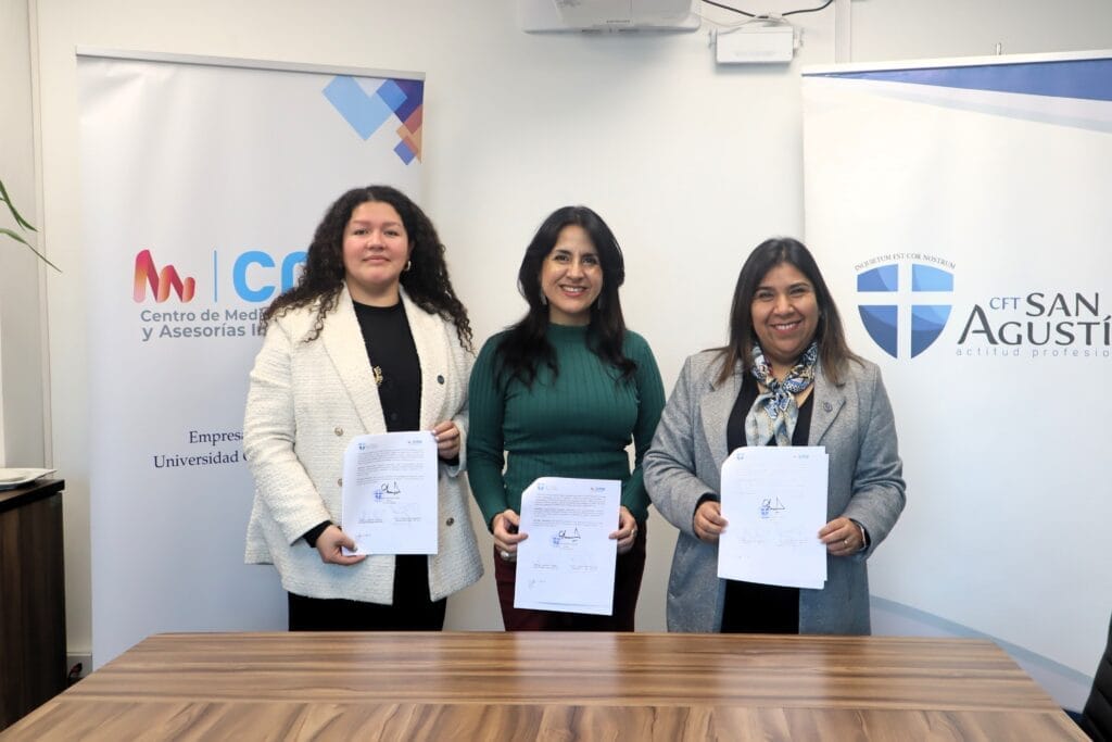 La firma se llevó a cabo en presencia de la directora de la sede Curicó, María Alejandra Rojas; la jefe de carrera de Trabajo Social, Karen Ruz; la gerente técnico del Centro de Mediación, Arbitraje y Asesorías Integrales de la UCM, Claudia Meriño, y el titulado de Técnico en Trabajo Social del CFT San Agustín, Gerson Becerra, quien fue pionero en realizar su práctica profesional en este lugar.